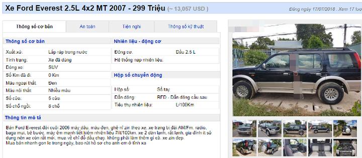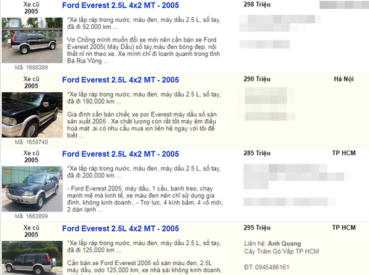 Khi tìm kiếm dòng xe này với giá 300 triệu đồng tại một website chuyên bán xe cũ và xe mới nổi tiếng, có 61 tin đăng bán xe, với giá rẻ nhất từ 120 triệu đồng xe đời 1995 và xe Everest tuổi đời 2006 - 2008.